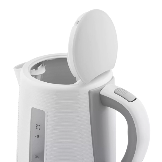 Шкала объема имеет удобные отметки, а для комфортного использования есть ручка с кнопкой открытия крышки. За включение отвечает отдельная клавиша, расположенная в нижней части чайника. Длина провода подставки составляет 80 см. Нагревательный элемент — скрытый.