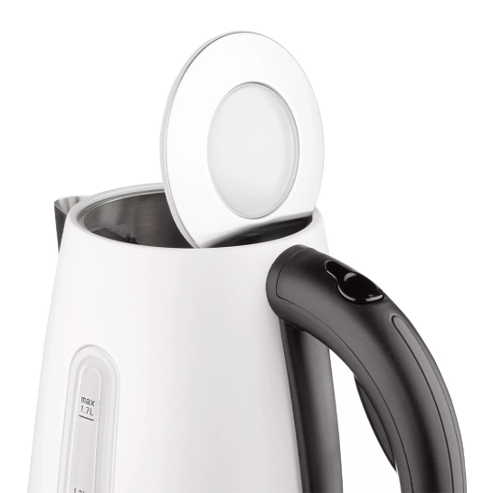 Для комфортного использования есть удобная ручка с кнопкой открытия крышки. За включение отвечает отдельная клавиша, расположенная в нижней части чайника. Длина провода подставки составляет 80 см. Работа чайника сопровождается LED-подсветкой прозрачной шкалы с отметками объема.