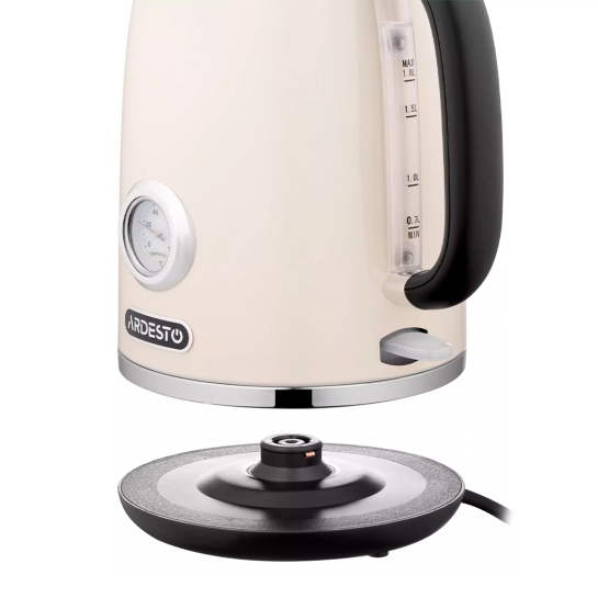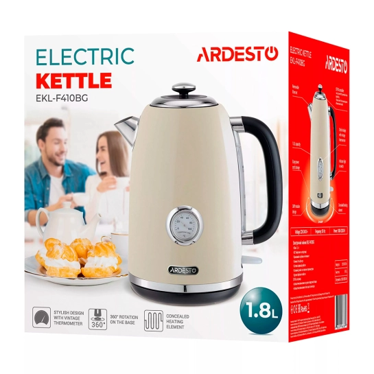Винтажный дизайн электрочайника ARDESTO EKL-F410BG бежевого цвета дополняет мощность 2 200 Вт, делая его незаменимым помощником в быту каждой семьи. Изготовлен из нержавеющей стали – универсального материала как по виду, так и по прочности, и не испортится из-за постоянного контакта с водой. Объема 1,8 л достаточно для семьи из 4 человек. Для дополнительного удобства оснащен индикатором температуры.