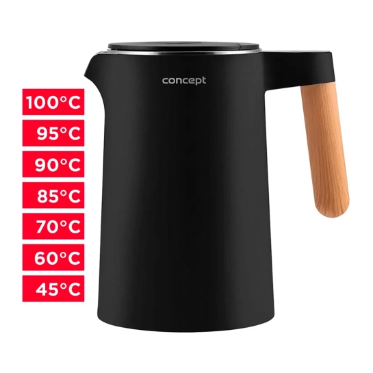 Электрический чайник Concept RK3301 с терморегуляцией удовлетворит даже самого взыскательного пользователя. Вы можете легко установить температуру воды от 45 до 100°C. Его оценят не только любители кофе и чая, но и родители маленьких детей, потому что его можно использовать в приготовлении детских каш. Также у электрочайника есть практичная функция Keep Warm, которая поддерживает желаемую температуру нагретой воды.