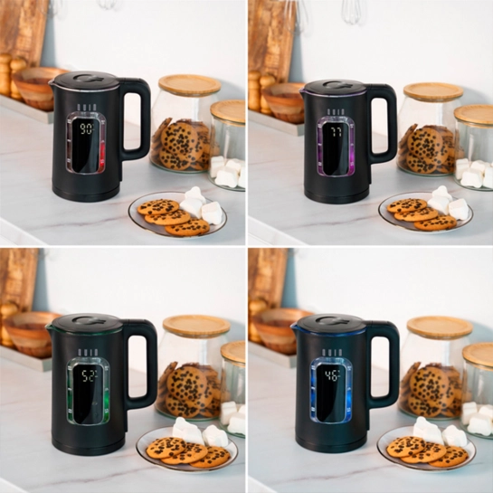 Светодиодная подсветка внутри меняет цвет в соответствии с температурой воды — от светло-голубой до красной, добавляя процесс привлекательности и информативности. Скрытый нагревательный элемент обеспечивает равномерный нагрев без накипи, а встроенные системы безопасности автоматически выключают чайник после закипания, защищая его от перегрева и работы без воды.