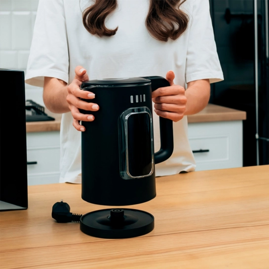 Электрочайник QUIN KTL-303 Black – это современный и стильный прибор, созданный для комфортного ежедневного использования. Конструкция с двойными стенками сочетает прочные боросиликатные стекла внутри и термостойкий пластиковый корпус снаружи, что обеспечивает безопасную температуру поверхности и сохраняет тепло внутри. Благодаря поворотной базе на 360° чайник удобно ставить в любом положении, а панорамное окно позволяет легко контролировать уровень воды.