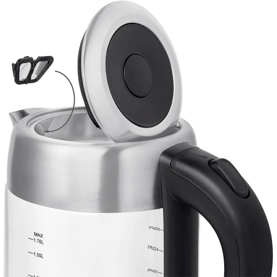 Электрочайник Rotex RKT87-SGS оснащен фильтром от накипи, что значительно упрощает уход за устройством и продлевает срок его службы. Защита от включения без воды и перегрева обеспечивает дополнительную безопасность в использовании, предотвращая возможные поломки и аварийные ситуации.