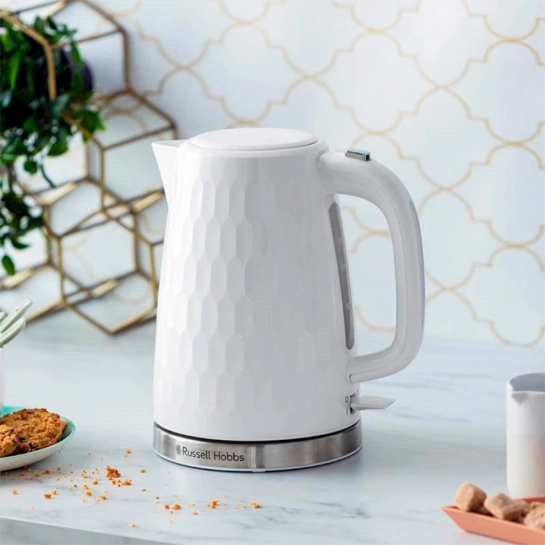 Russell Hobbs — признанный британский бренд, известный своим качеством и инновациями в области мелкой бытовой техники. Этот электрочайник модели Honeycomb впечатляет своим стильным дизайном и современными характеристиками. Его премиальный белый корпус выполнен в форме пчелиных сот с элементами из нержавеющей стали, что добавляет кухонному интерьеру изысканности и элегантности.