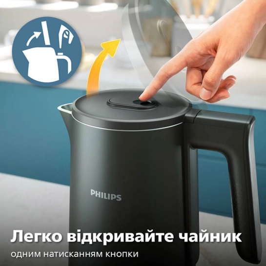 Легко открывайте чайник одним нажатием кнопки с помощью шарнирной крышки.