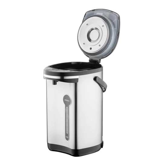Объём резервуара в 6 литров позволяет обеспечить горячей водой большое количество людей без необходимости частого доливания. Корпус изготовлен из высококачественной нержавеющей стали SUS304, которая отличается долговечностью, устойчивостью к коррозии и лёгкостью в уходе. Термопот установлен на поворотной базе с вращением на 360°, благодаря чему к устройству удобно подойти с любой стороны — особенно в условиях ограниченного пространства.