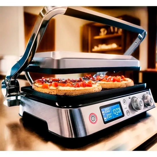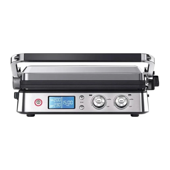 Хотя гриль один, он может готовить одновременно два блюда двумя разными способами. Отрегулируйте температуру для каждой пластины по своему усмотрению, чтобы получить уникальный результат. Так, например, можно сильно прожарить нижнюю половину горячего бутерброда, лишь разогрев верхнюю, чтобы начинка, расположенная на ней, не утратила изначальных вкусовых качеств. Максимально точное поддержание температуры (60-230 град.) гарантирует электроника. Потребляемая мощность не превышает 2000 Вт., что можно считать довольно экономичным показателем.