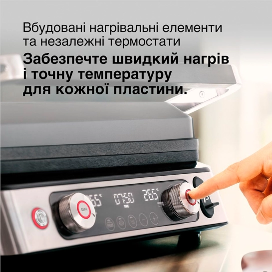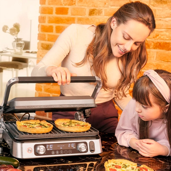 Необычайная точность и универсальность у вас под рукой. Два независимых электронных регулятора температуры позволяют точно установить температуру каждой пластины по отдельности, чтобы вы могли одновременно готовить два вида пищи на двух разных температурах.
