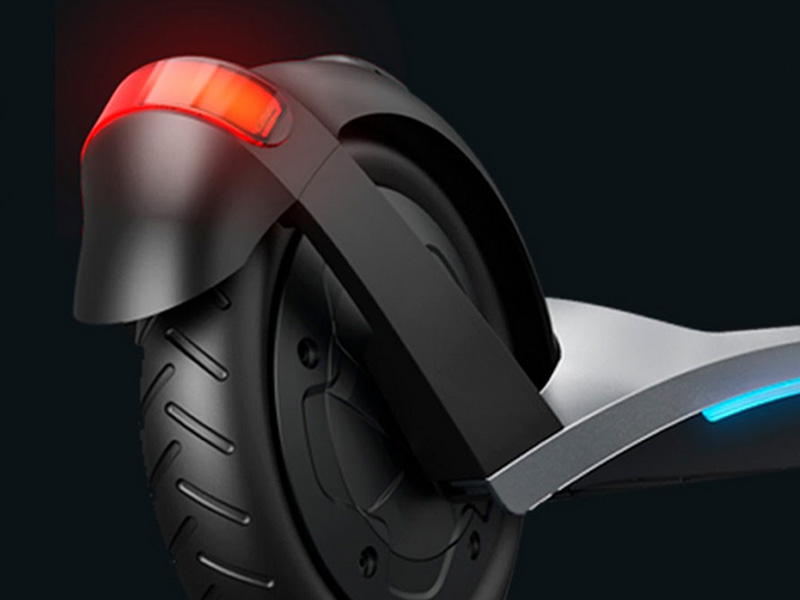 Мощная LED фара сертифицирована по стандарту E-mark, а набор световых элементов (стоп-сигнал и боковые габаритные огни) отлично обозначают самокат на дороге.