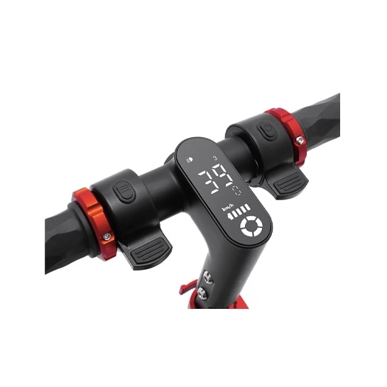 Элементы управления расположены на рукоятках руля: по бокам от бортового компьютера расположены ручки газа и электронного рекуперативного тормоза, на них установлены - кнопка включения и отключения самоката, она же переключатель скоростей (всего предусмотрено 3 скорости), на второй кнопке управление светом и звуковым сигналом. Важное достоинство - возможность ограничения максимальной скорости путём установки определённой скорости (максимальная скорость для 1 скорости - 20 км/ч, для второй - 26 км/ч, для третей - 30-35 км/ч). Ограничение максимальной скорости особо актуально при езде на неровных участках и в плохих погодных условиях.