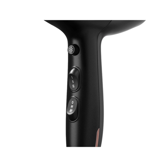 Максимальная мощность устройства — 2200 Вт. Предусмотрена защита от перегрева, поддерживаются две скорости и три температурных режима, которые можно выбрать с помощью клавиш управления на ручке. Съёмная насадка-концентратор улучшает распределение воздушного потока, а функция Cool Shot обеспечивает более щадящую сушку ослабленных волос холодным воздухом.