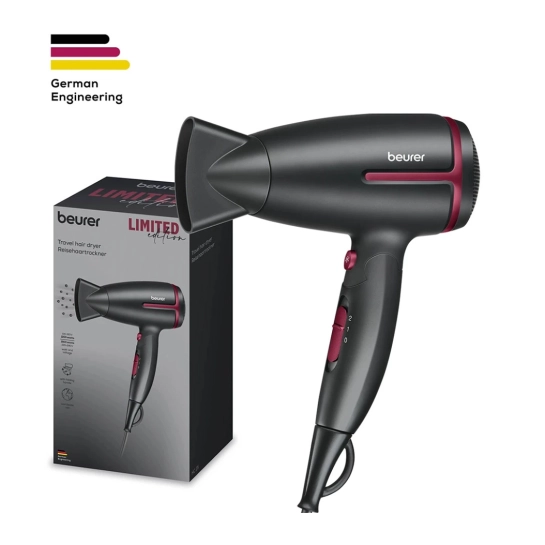 Мощный туристический фен BEURER HC 25 — идеальный спутник для путешествий. Его можно использовать по всему миру благодаря функции переключения напряжения. Встроенная ионная функция придаёт волосам дополнительный блеск, а складная ручка позволяет экономить место в багаже.