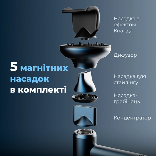 - Насадка с эффектом Коанда: разглаживает и укладывает волосы, направляя воздушный поток и уменьшая неопрятный разлет прядей.