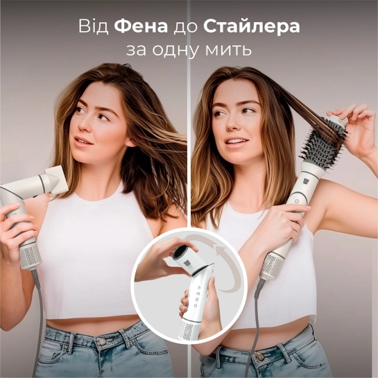 AENO Hair Styler & Dryer HS1 имеет уникальный механизм поворота, который без труда превращает устройство из высокопроизводительного фена в универсальный инструмент для укладки. Эта инновационная конструкция позволяет быстро переключаться между режимами сушки и укладки, что делает его идеальным для быстрой и бесперебойной процедуры укладки.
