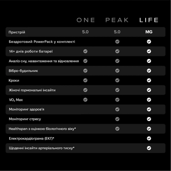 - WHOOP Peak — расширенный пакет для пользователей, которые хотят контролировать не только физическую форму, но и долгосрочное здоровье. Он добавляет к возможностям WHOOP One больше показателей и инструментов для мониторинга выносливости и долголетия.