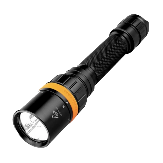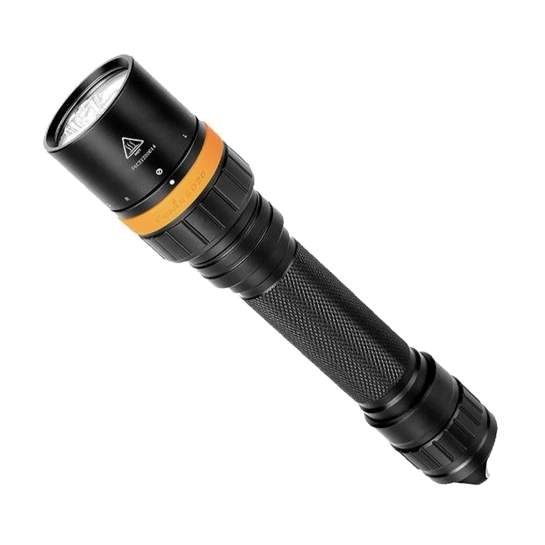 В отличие от предыдущей дайвинговой модели, Fenix SD20 получил более удобную систему управления. Теперь за включение фонаря и выбор нужного режима отвечает поворотное кольцо. Оно, как и весь корпус, хорошо герметизировано двойными резиновыми уплотнителями. Уровень водонепроницаемости SD20 равен IPX-8. Фонарь в состоянии эффективно работать на глубине вплоть до 100 метров. Корпус для него изготовлен из алюминия — легкого и прочного металла, который не подвержен образованию ржавчины. Он сделан двойным, чтобы максимально обезопасить все внутренние механизмы фонаря. Отверстие для темляка увеличено, а сам он удобно затягивается по размеру запястья, чтобы фонарь не выпал случайно из рук во время плавания.