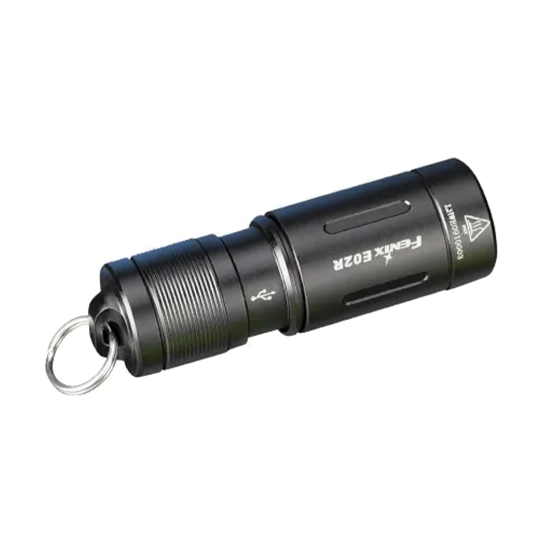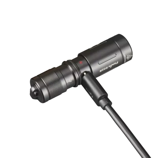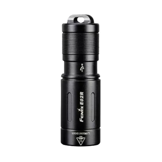 Модель Fenix E02R являет собой аккумуляторный прибор, который окажет пользу в качестве брелка на ключи. Одно из основных преимуществ фонаря – его компактные размеры. Весит он не более 15 грамм. Такой миниатюрный фонарик даёт световой поток в 200 люменов, а дистанция распространения луча достигает 49 метров. Функционирует со встроенным аккумулятором ёмкостью в 120 миллиампер-часов. Литий-полимерный аккумулятор обеспечивает работу фонарика, а освещение получается за счёт применения светодиода Cree XP-G2 S3. Освещение – белого цвета. Предусмотрен порт micro-USB для подзарядки аккумулятора.
