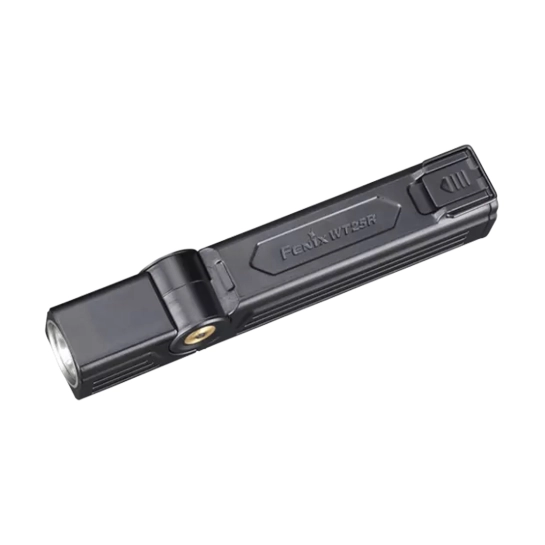 Fenix WT25R отличается уникальным дизайном корпуса. Он имеет встроенную клипсу, чтоб применение его было ещё удобнее и легче. При желании вы можете установить фонарь вертикально, как свечку, и руки при этом остаются свободными для выполнения дел. Либо же можно примагничивать модель к металлическим поверхностям. Управляется при помощи одной кнопки, она находится сбоку корпуса, на оси регулировки «головы». Контакты тут позолоченные, за счёт чего гарантирована замечательная электрическая проводимость. Помимо того, позолота защищает контакты от коррозии.