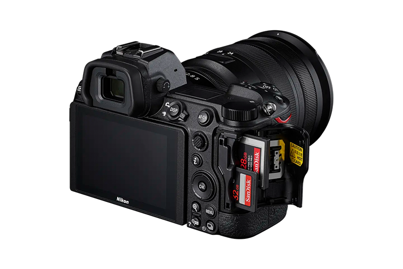 Двойные гнезда для карт памяти позволяют использовать карты UHS-II SD в одном гнезде и карты XQD или сверхбыстрые CFexpress в другом. Настройте фотокамеру, чтобы использовать вторую карту при переполнении основной, для резервного копирования или отдельного хранения изображений в форматах RAW и JPEG или отделения фотографий от видео.