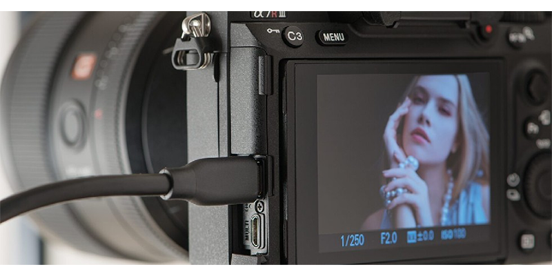 Камера α7R III оборудована портом USB Type-C, поддерживающим SuperSpeed USB 5Gbps (USB 3.2), и разъемами для синхронизации, через которые ее можно подключать непосредственно к внешним устройствам без задержки. Это позволяет эффективнее и быстрее работать даже во время студийной съемки, когда камерой или вспышкой управляют с компьютера.