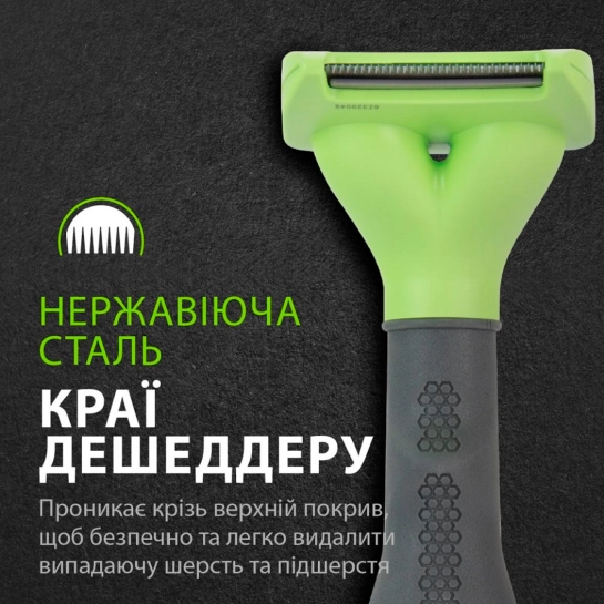 - ЛЕЗВИЕ ИЗ НЕРЖАВЕЮЩЕЙ СТАЛИ. Проникает сквозь остевой волос, не повреждая его, и легко вытаскивает мертвые, слабо прикрепленные волоски подшерстка. Изогнутое лезвие соответствует контурам тела питомца для комфорта в процессе вычесывания