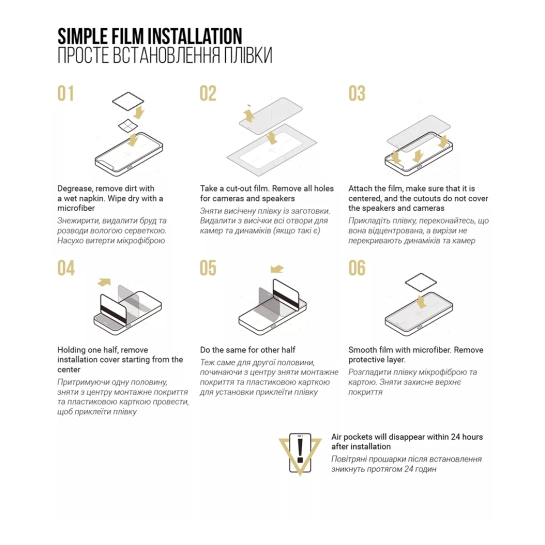 Плёнка обеспечивает высокую прозрачность, что позволяет сохранить естественную цветопередачу, яркость и чёткость изображения. Она поддерживает комфортное управление смартфоном, не ухудшая чувствительность сенсора и не влияя на скорость распознавания прикосновений. Экран остаётся чистым, гладким и приятным на ощупь, а отпечатки пальцев и разводы удаляются без лишних усилий.