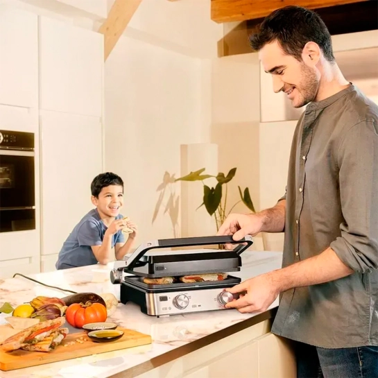 Хотя гриль один, он может готовить одновременно два блюда двумя разными способами. Отрегулируйте температуру для каждой пластины по своему усмотрению, чтобы получить уникальный результат. Так, например, можно сильно прожарить нижнюю половину горячего бутерброда, лишь разогрев верхнюю, чтобы начинка, расположенная на ней, не утратила изначальных вкусовых качеств. Максимально точное поддержание температуры (60-230 град.) гарантирует электроника. Потребляемая мощность не превышает 2000 Вт., что можно считать довольно экономичным показателем.