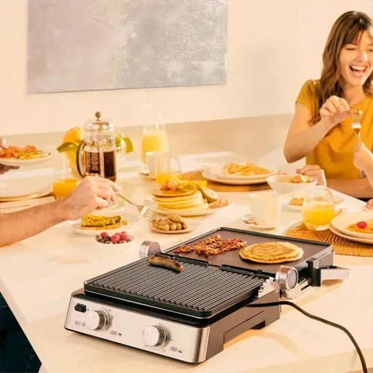 От стейков, рыбы, овощей до кесадильи, панини, блинов или яйц – этот гриль может сделать все. Две пластины с антипригарным покрытием – гриль и плоская – позволяют готовить любое блюдо, в зависимости от ваших кулинарных предпочтений.