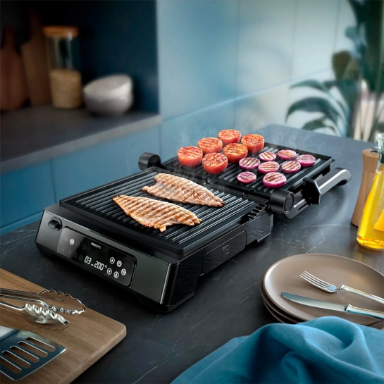 Наслаждайтесь приготовлением на гриле с 8 предустановками: размораживание, котлета для бургера, рыба, курица, овощи и мясо (3 степеней прожарки).