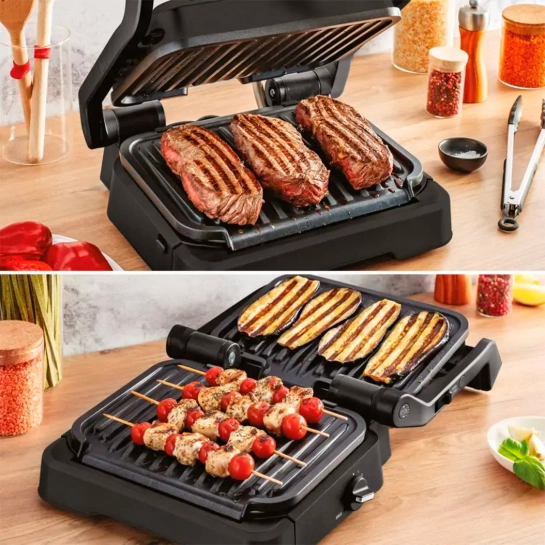 Получите большую площадь для приготовления и устройте барбекю прямо посреди стола. При открывании гриля на 180С, 4-х позиционный термостат поддерживает одинаковую температуру с обеих сторон. Превратите ужин с друзьями в интересное и вкусное развлечение.