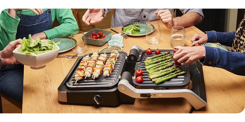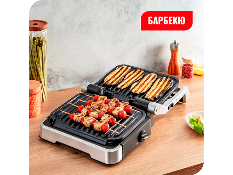 Получите большую площадь для приготовления и устройте барбекю прямо посреди стола. При открывании гриля на 180С, 4-х позиционный термостат поддерживает одинаковую температуру с обеих сторон. Превратите ужин с друзьями в интересное и вкусное развлечение.