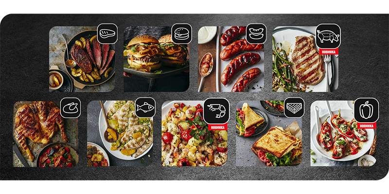 Красное мясо, Бургер, Птица, Сэндвич, Колбаса, Рыба, а также новые режимы Свинина, Перец, Морепродукты.
