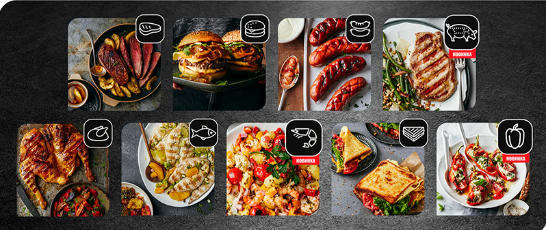 Красное мясо, Бургер, Птица, Сэндвич, Колбаса, Рыба, а также новые режимы Свинина, Перец, Морепродукты.