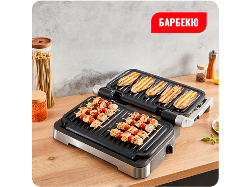 Получите большую площадь для приготовления и устройте барбекю прямо посреди стола. При открывании гриля на 180С, 4-х позиционный термостат поддерживает одинаковую температуру с обеих сторон. Превратите ужин с друзьями в интересное и вкусное развлечение.