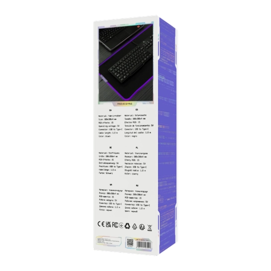 Одной из ключевых особенностей коврика является наличие 15 RGB-эффектов, которые могут быть настроены для создания уникальной атмосферы во время игры. Эти эффекты легко управляются через USB to Type-C коннектор, который также обеспечивает питание от источника. Дополнительно, коврик имеет длину кабеля 1.8 метра, что обеспечивает достаточную гибкость в расположении без ограничений.