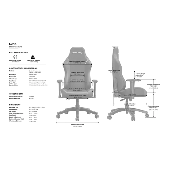 Andaseat Luna, изготовленный из крепкого 100% стального каркаса, гарантирует долговечность и стабильность, обеспечивая необходимую поддержку во время интенсивных игр или работы. Колесная база из нейлона премиум-класса обеспечивает плавность и долговечность передвижения по различным поверхностям пола, что повышает общую универсальность кресла.