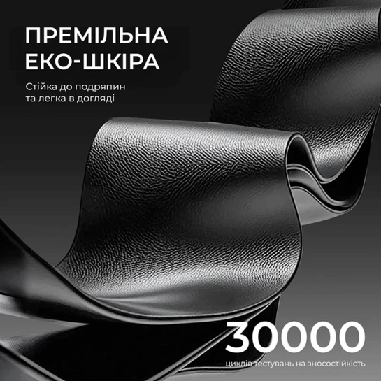 Обивка кресла выполнена из премиальной эко-кожи, устойчивой к появлению царапин и лёгкой в уходе. Материал прошёл тестирование на 30 000 циклов износа, что гарантирует сохранение аккуратного внешнего вида и долговечность. Приятная текстура и прочность обивки подчёркивают премиальность модели.