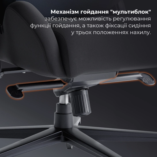 Механизм качания "мультиблок" обеспечивает возможность регулировки функции качания, а также фиксации сидения в трех положениях наклона. Также мультиблок управляет функцией регулировки высоты сиденья благодаря газ-лифту 4 класса, что в тандеме обеспечивает максимальную гибкость и легкость настройки вашего кресла. Металлическое основание и нейлоновые колеса увеличенного размера диаметром 75 мм гарантируют устойчивость и плавное движение.