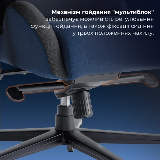 Механизм качания "мультиблок" обеспечивает возможность регулировки функции качания, а также фиксации сидения в трех положениях наклона. Также мультиблок управляет функцией регулировки высоты сиденья благодаря газ-лифту 4 класса, что в тандеме обеспечивает максимальную гибкость и легкость настройки вашего кресла. Металлическое основание и нейлоновые колеса увеличенного размера диаметром 75 мм гарантируют устойчивость и плавное движение.