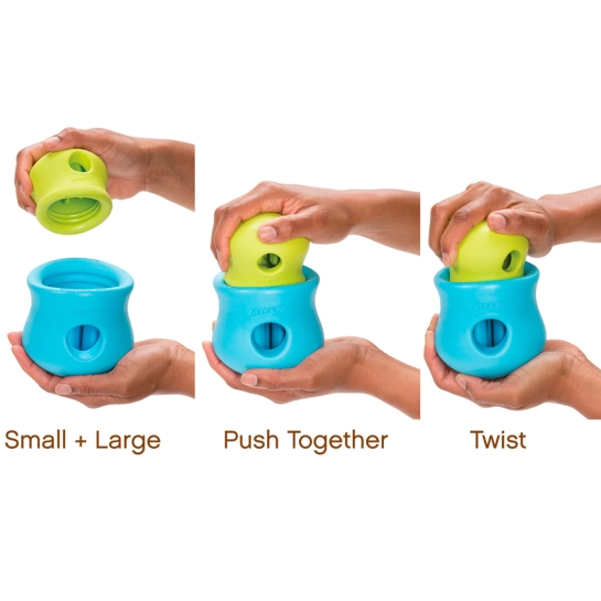 Отмеченные наградами игрушки-головоломки с тайником для лакомств придуманы так, что большая и маленькая соединяются в одну головоломку для собаки, а это удваивает и усложняет миссию супергероя.