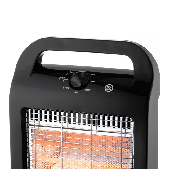 Обогреватель имеет три галогенных лампы, которые отличаются мгновенным нагревом и могут работать в трех режимах – 400 Вт, 800 Вт или 1200 Вт. Корпус прибора поворачивается на 90 градусов для равномерного обогрева со всех сторон. Для предупреждения перегрева есть предохранительный термостат.