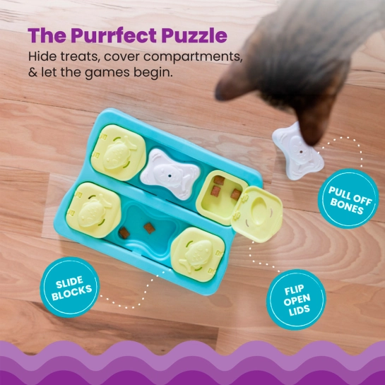 Спрячьте лакомства, закройте отсеки и начните игру. Чтобы достать награду, котику нужно будет вытолкнуть элемент пазла — косточку, открыть крышку и сдвинуть блок головоломки.