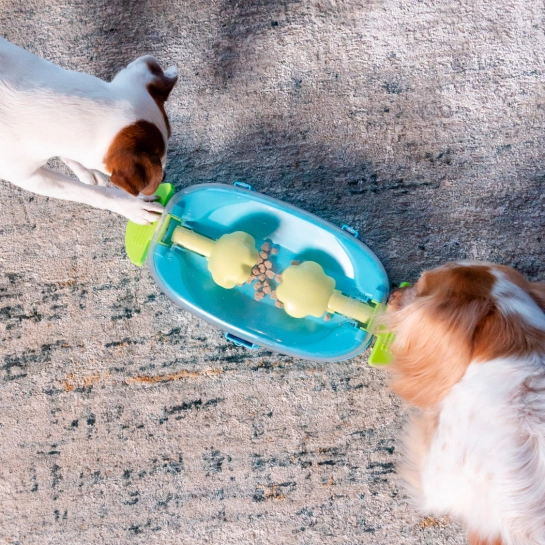 Наполните головоломку лакомствами или гранулами корма. Чтобы достать угощение, собаке нужно нажать на ручки и активировать механизм, высвобождающий лакомства изнутри.