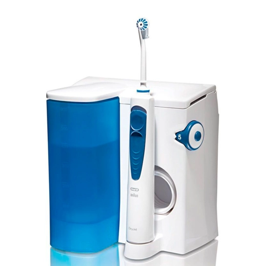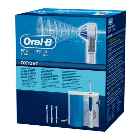Ирригатор Braun MD 20 Oral-B Professional Care OxyJet. Уникальная технология OxyJet (обогащает воду микропузырьками, обеспечивая удаление бактерий, налета и остатков пищи из труднодоступных участков ротовой полости, проводит массаж десен и предотвращает появление зубного камня). Режимы работы: 2 (монопоток и турбопоток). Плавный пятиступенчатый регулятор давления воды (для тщательной чистки труднодоступных участков или для бережного ухода за чувствительными зонами). Количество насадок: 4 («OxyJet» ED 17). Объем контейнера для воды: 600 мл. Воздушный фильтр. Контейнер для хранения насадок. Влагоустойчивый корпус. Прорезиненная ручка. Система питания: от сети 220V.