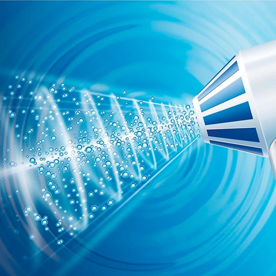 Множество микропузырьков, которые образуются в водяном потоке при нагнетании в нем воздуха, мягко и эффективно вымывают налет и остатки пищи. Благодаря микропузырьковой технологии ирригатор выполняет не только очень тщательную чистку пространства между зубами, но и массаж десен.