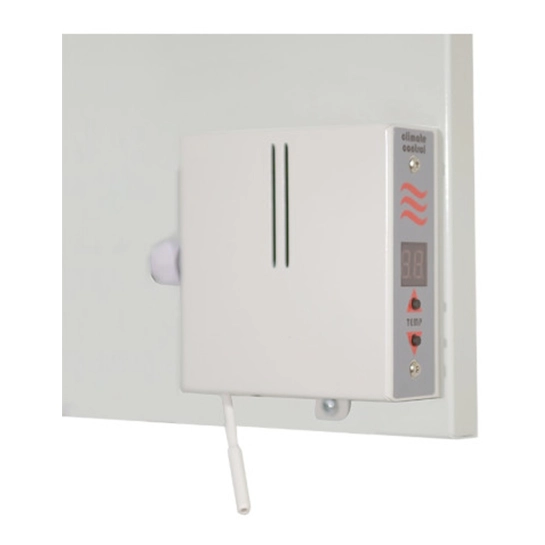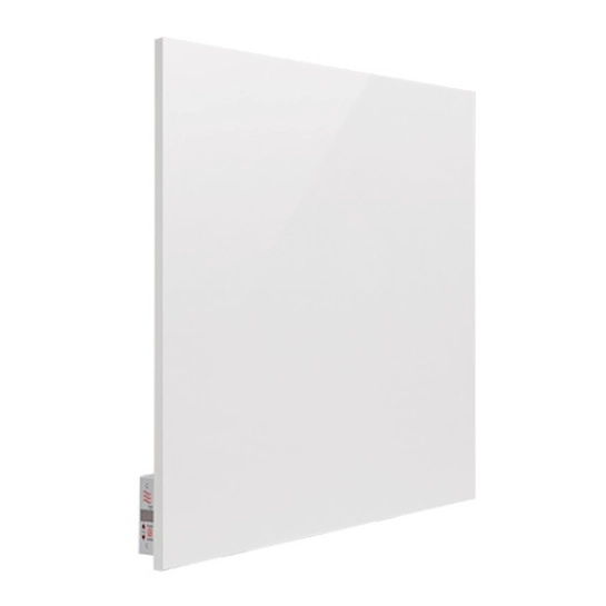Экран терморегулятора аккуратно расположен сбоку корпуса, не нарушая эстетики керамической панели. Управление осуществляется двумя кнопками, что делает настройку интуитивной и быстрой. Панель выглядит современно и легко вписывается в любой интерьер, оставаясь незаметной и при этом эффективно выполняя свою функцию.