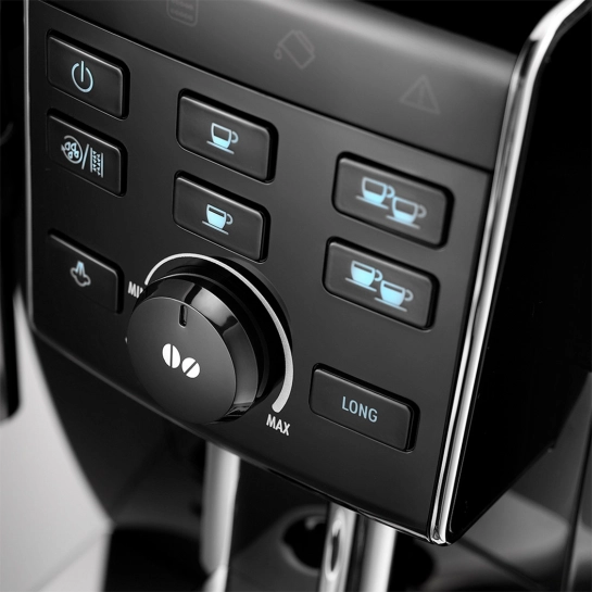 - Кофемашина оснащена удобной кнопочной панелью управления, позволяющей легко выбирать желаемый вид напитка и настраивать параметры приготовления – от крепости до объема кофе.