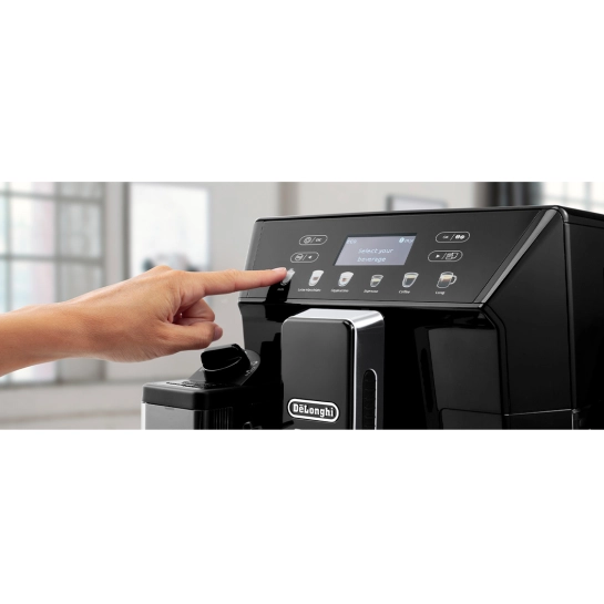 Управление кофемашиной DeLonghi ECAM 46.860 B Eletta Cappuccino EVO очень простое и интуитивно понятное. Информационный дисплей и сенсорное управление позволяют быстро и легко задать требуемый режим приготовления. Регулировка крепости напитка, его объем, температуры, высоту молочной пены и множество других параметров задаются несколькими нажатиями.