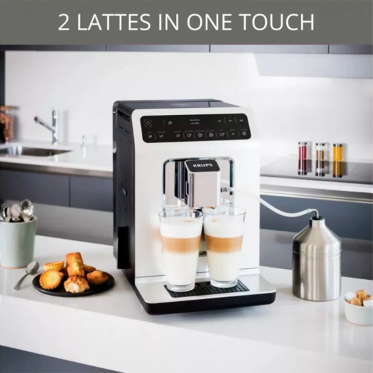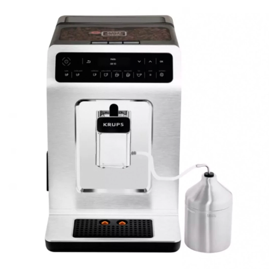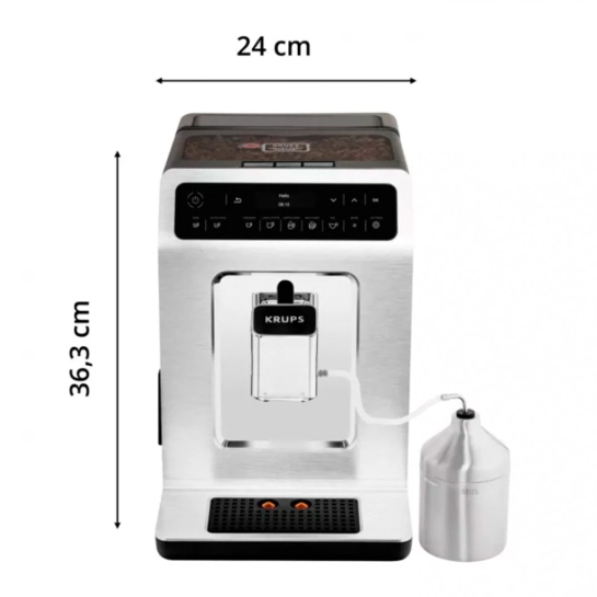 Автоматическая кофемашина KRUPS EVIDENCE EA891C10 в цвете хром — это современная кофемашина с автоматическим приготовлением капучино, оснащенная сенсорным управлением для максимально удобного использования. Мощность устройства составляет 1450 Вт, что обеспечивает быстрое приготовление напитков. Контейнер вмещает до 10 кофейных порций. Доступна ручная регулировка степени помола (3 режима), что позволяет подстраивать вкус кофе под индивидуальные предпочтения. Среди полезных функций: автоматическая очистка молочника, автоматические программы по уходу, возможность программирования любимых рецептов, система быстрого выброса кофе, система приготовления латте и капучино прямо из пакета с молоком в чашку, установка жесткости воды. Производство — Франция.