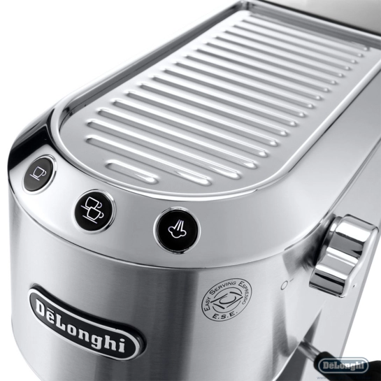 Коллекция: Dedica. Мощность: 1350 Вт. Давление: 15 бар. Компактный дизайн - ширина 15 см. Тип работы: полуавтомат. Встроенный капучинатор. Подогрев чашек. 2 крема-фильтра: на одну порцию кофе, на две порции кофе. Тип используемого кофе: молотый и чалды. Объем контейнера для воды: 1 л. Материал корпуса: металл. Съемный поддон. Профессиональный холдер. Темпер. Максимальная высота чашки: 8 см (при снятом поддоне 12 см). Программирование настроек: температура воды, жесткость воды, автоотключение через 9 мин / 30 мин / 3 часа.